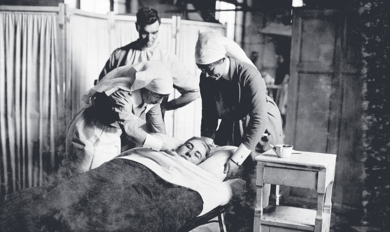 Two Canadian nurses caring for wounded soldiers inside a casualty clearing station during the First World War, 1918, from the George Metcalf Archival Collection at the Canadian War Museum.
